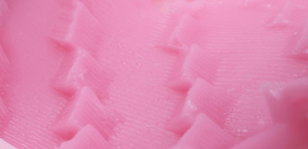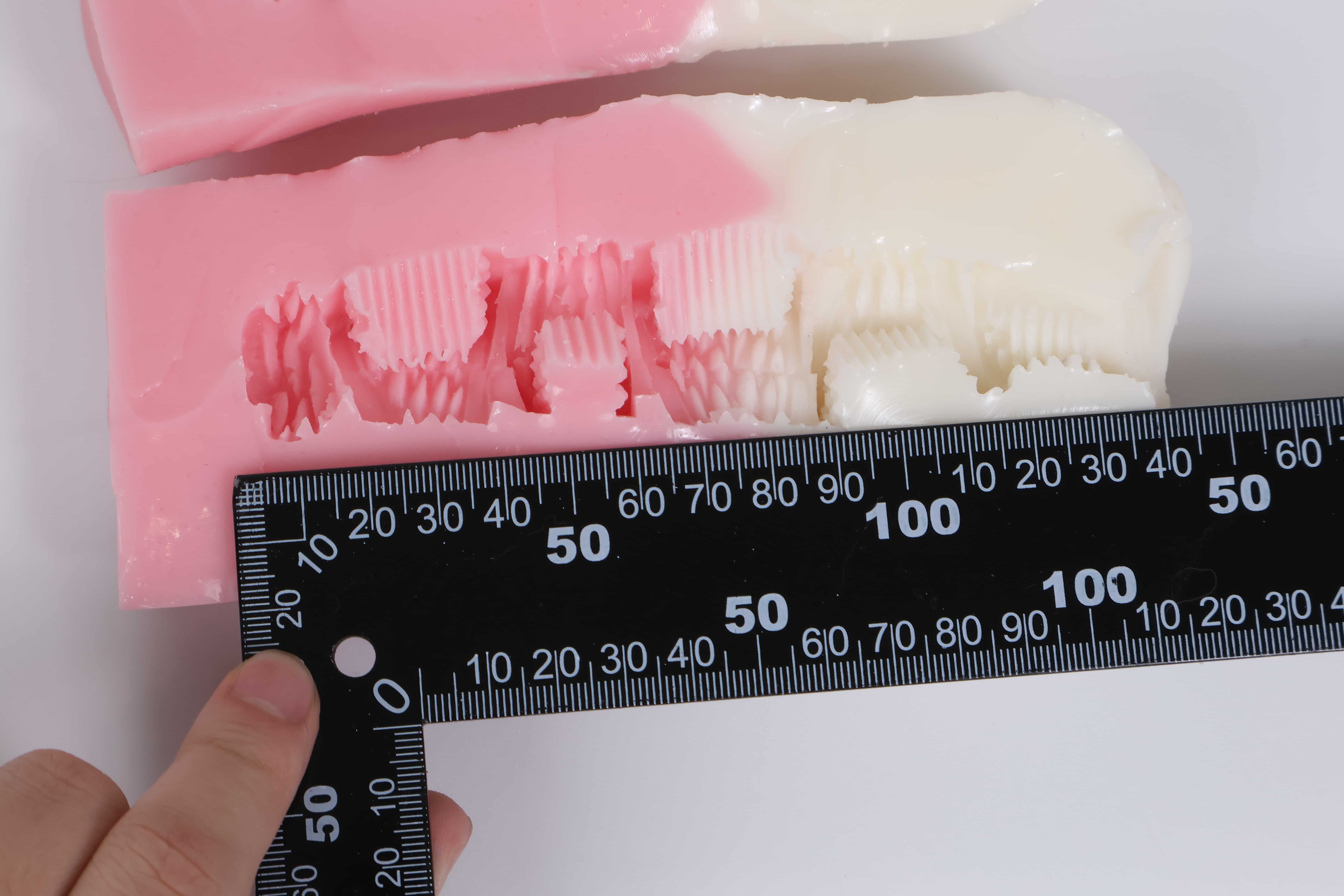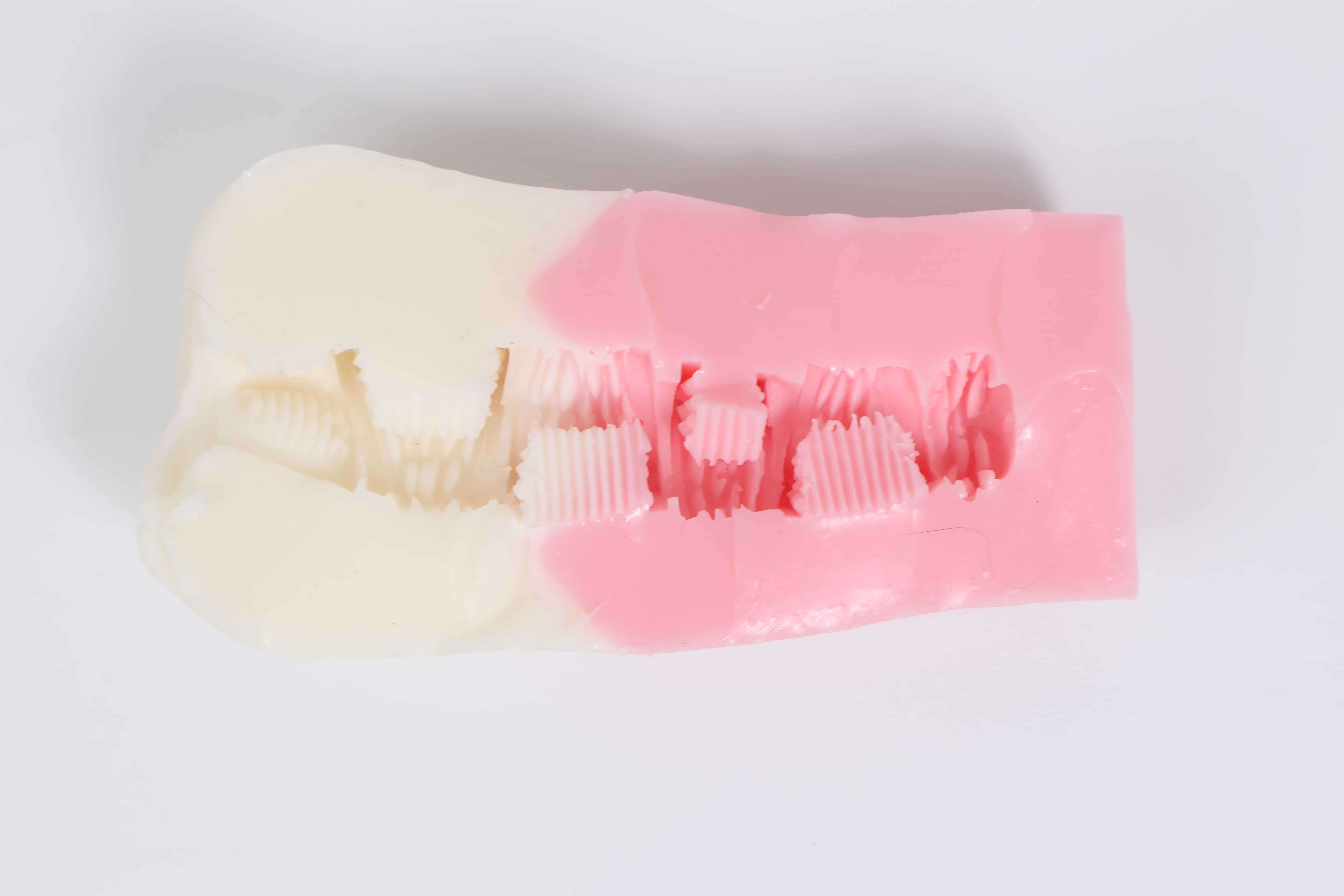 前后采用两种不同硬度的材料,前段白色的软度为-3,后段粉色料则为-1材料