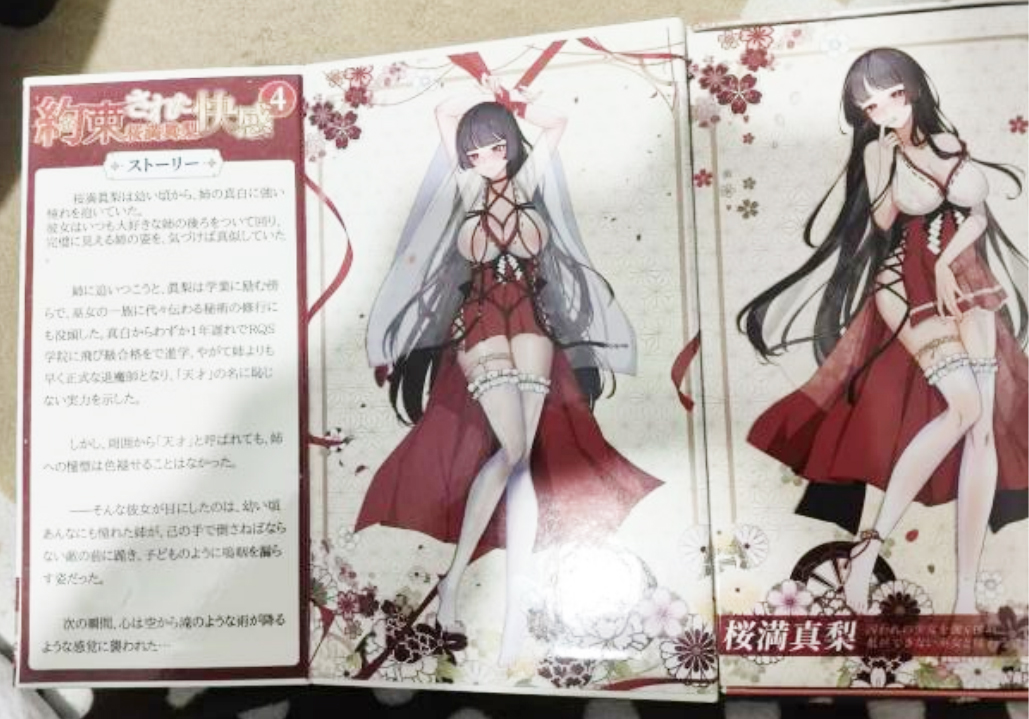 包装打开也是和白丝类似的三折叠豪华包装。左边是人物介绍而右边是立绘。中间这张包成粽子了属于是,巫女御姐的面部还有红色点缀,涩得一批